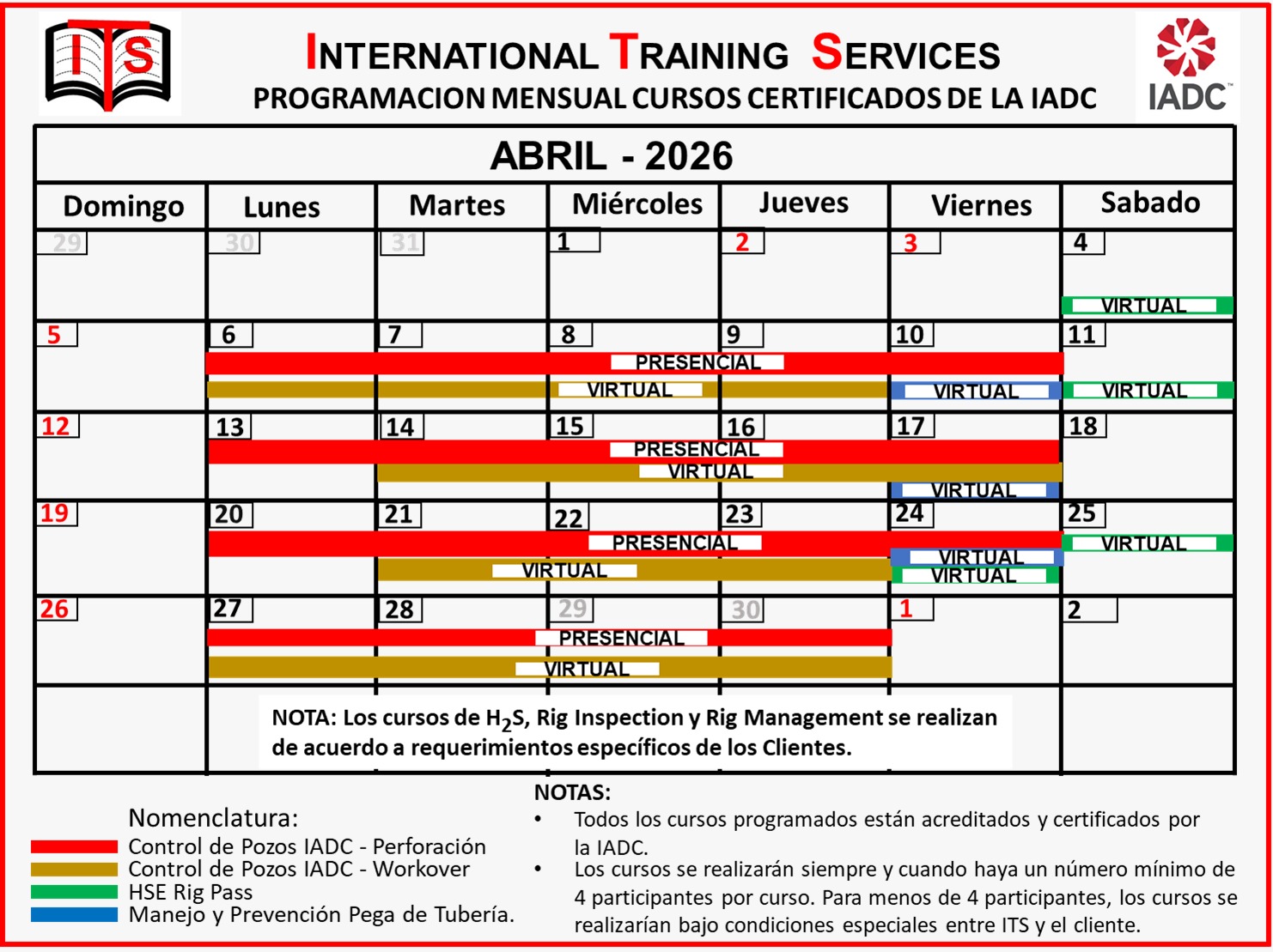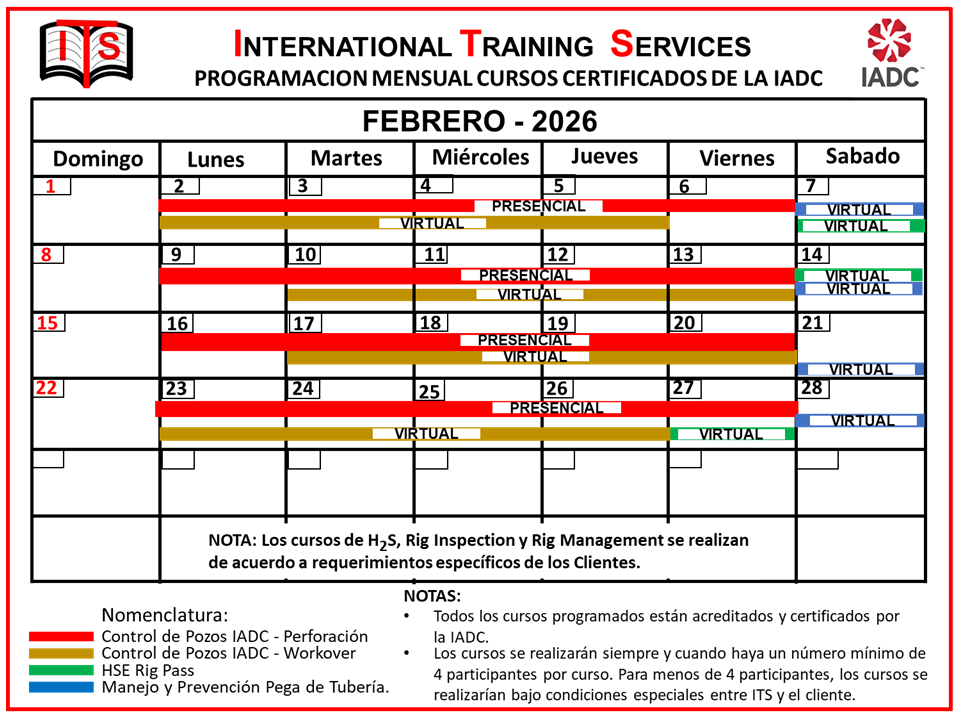 La Empresa International Training Services SAS, fue creada como una compañía dedicada a la Capacitación y Entrenamiento con el objetivo de impartir Cursos de Control de Pozos, Prevención de Pega de Tubería, Seguridad Industrial (Rig Pass), Cursos Técnicos de operaciones de Perforación y Reacondicionamiento de Pozos, al igual que cursos relacionados con la gestión en HSEQ y la Seguridad y Salud en el Trabajo.