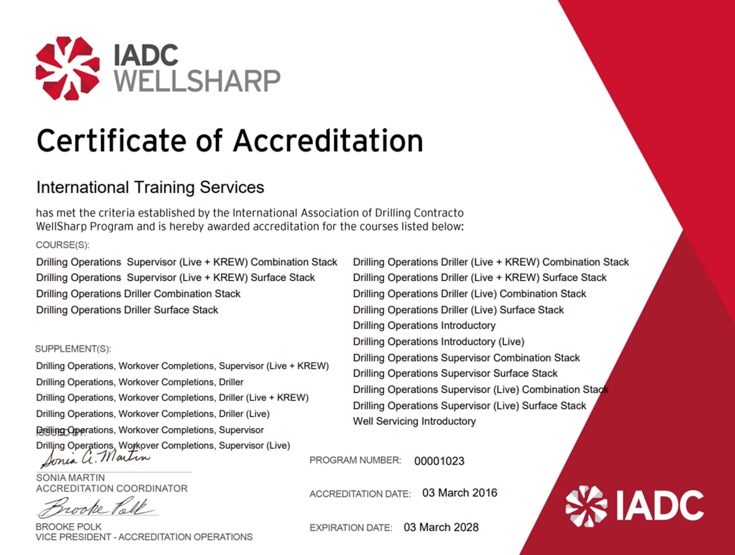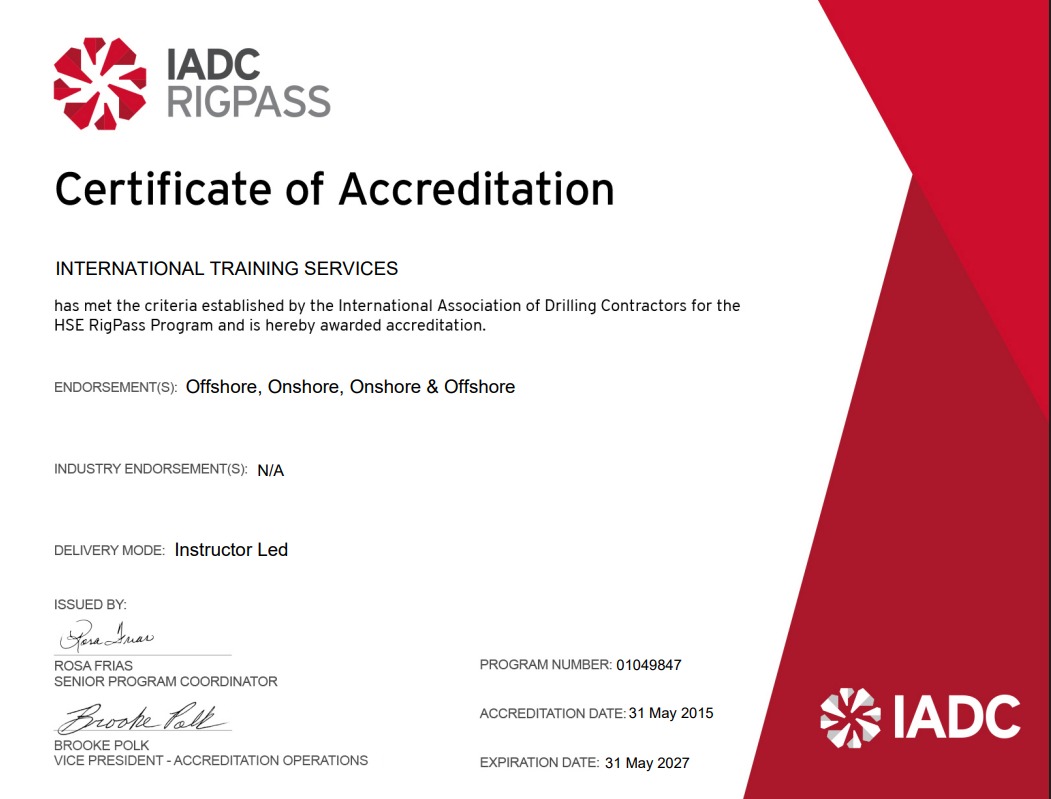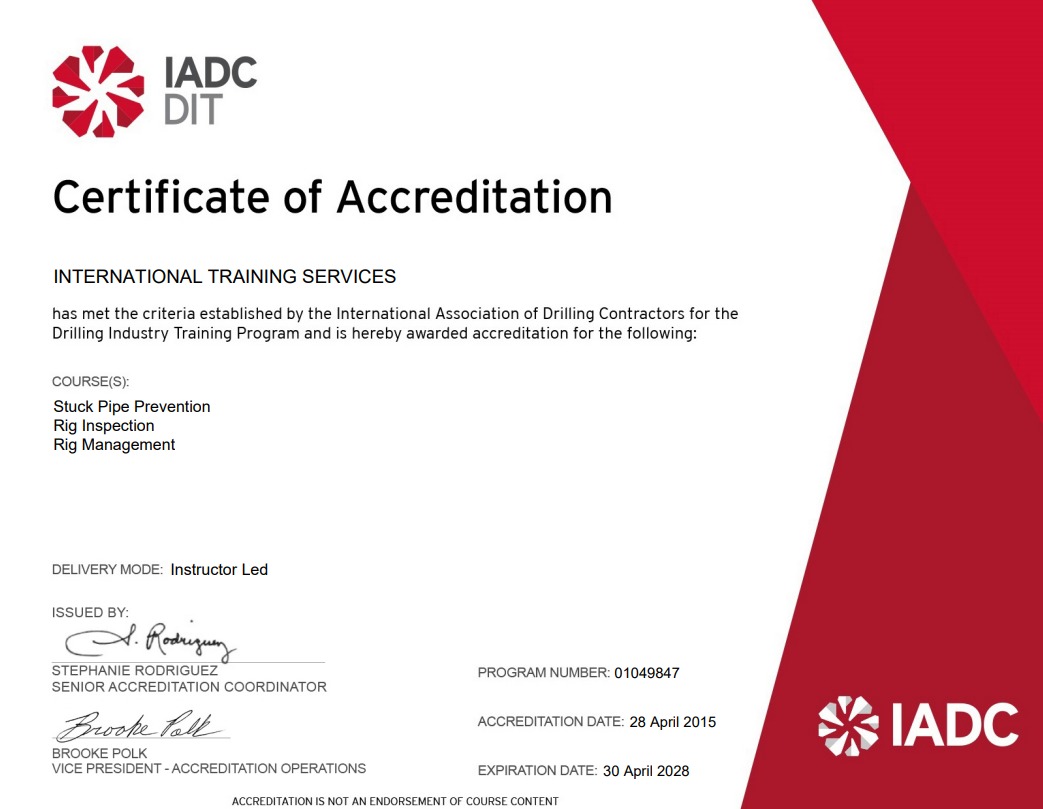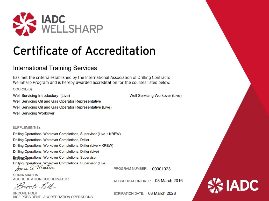 Los cursos de Control de Pozos, Prevención de Pega de Tubería y RIG PASS están acreditados y certificados por la IADC (International Association of Drilling Contractors) en los programas WELLSHARP con el número de acreditación 01023, DIT con el número de acreditación 01049847 y RIG PASS con el número de acreditación R1049847.